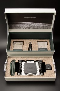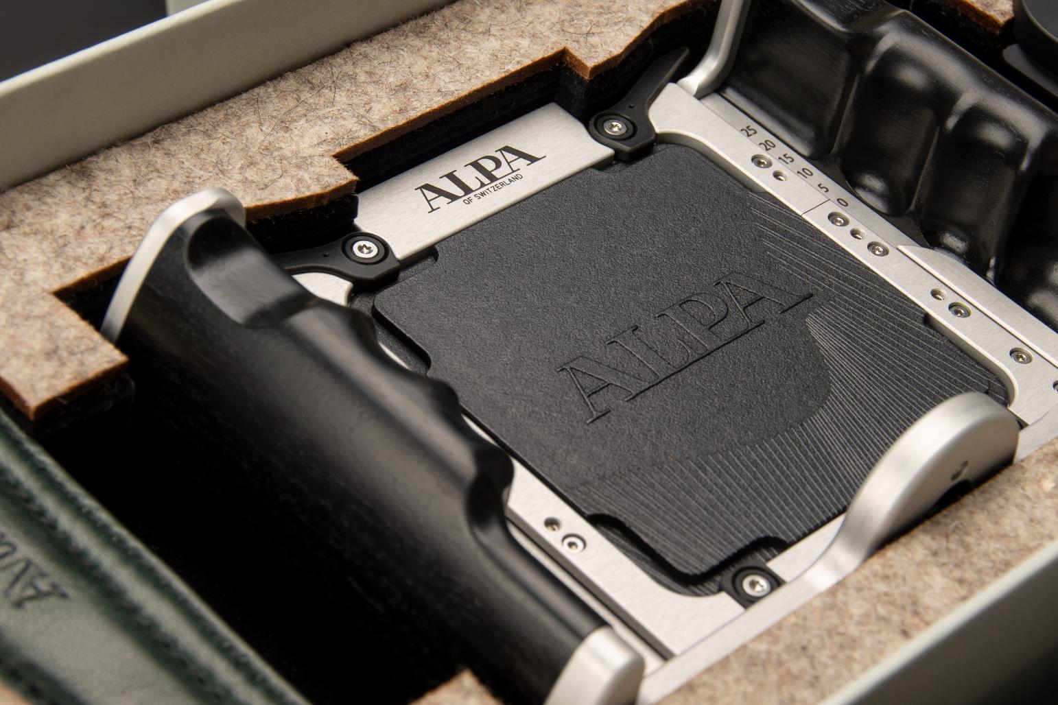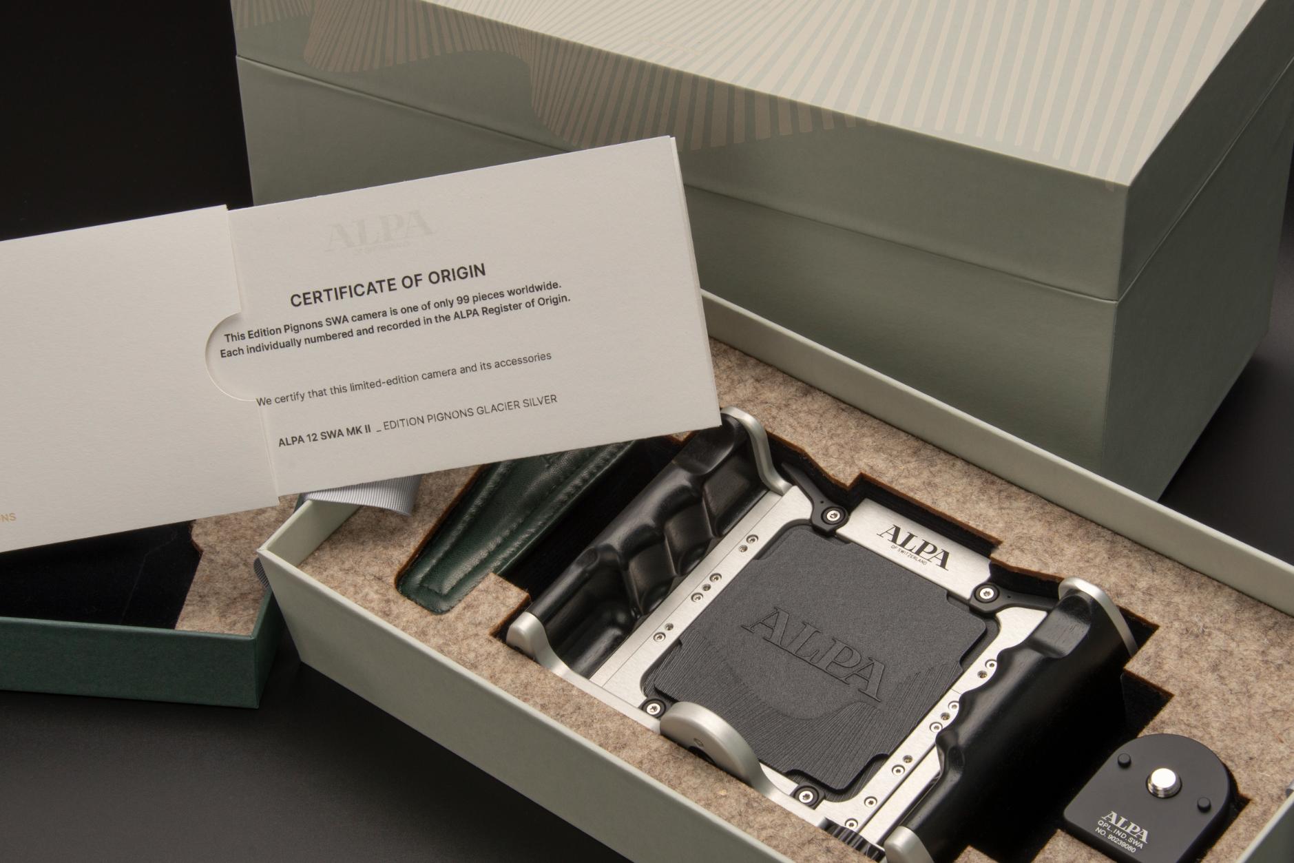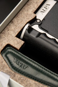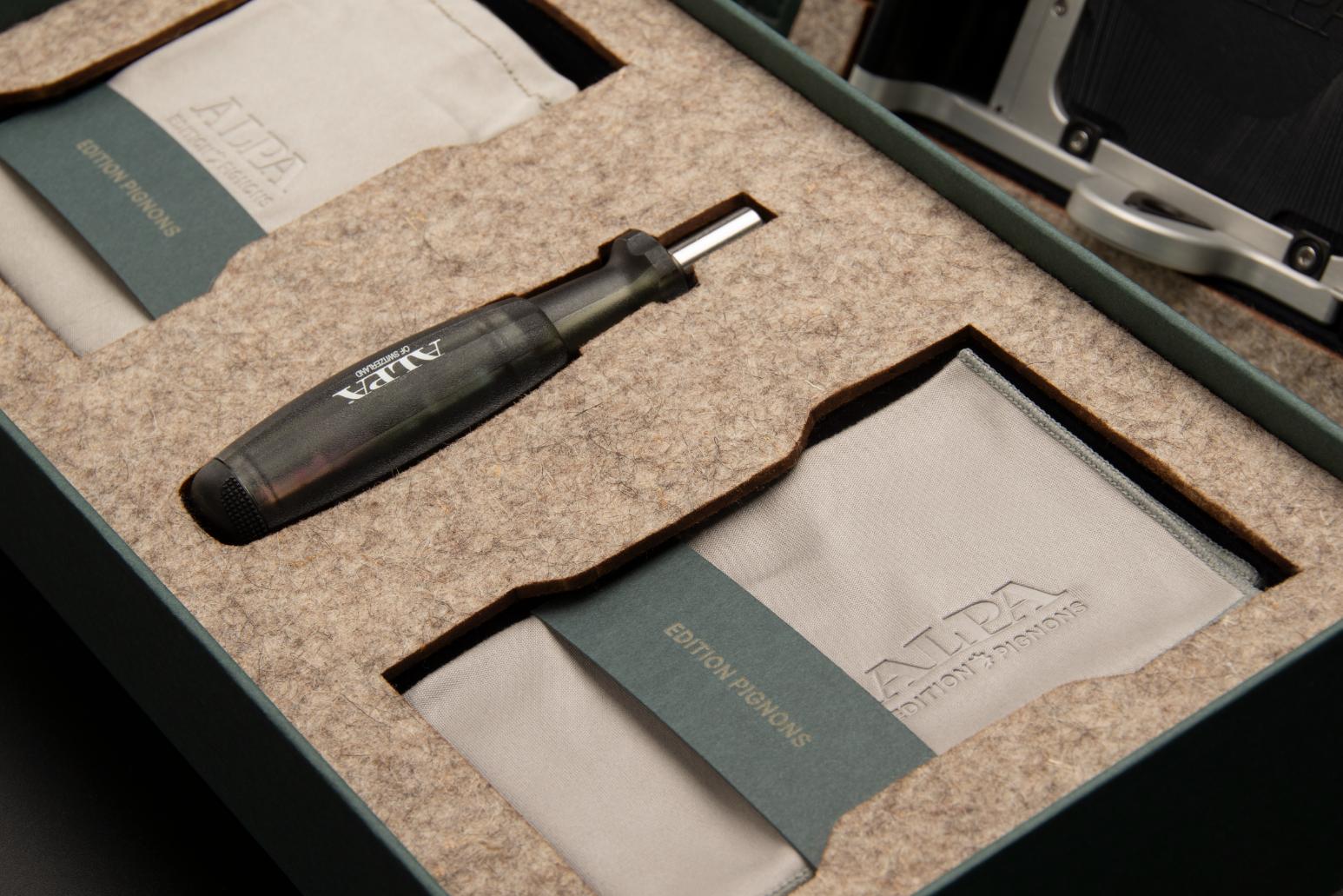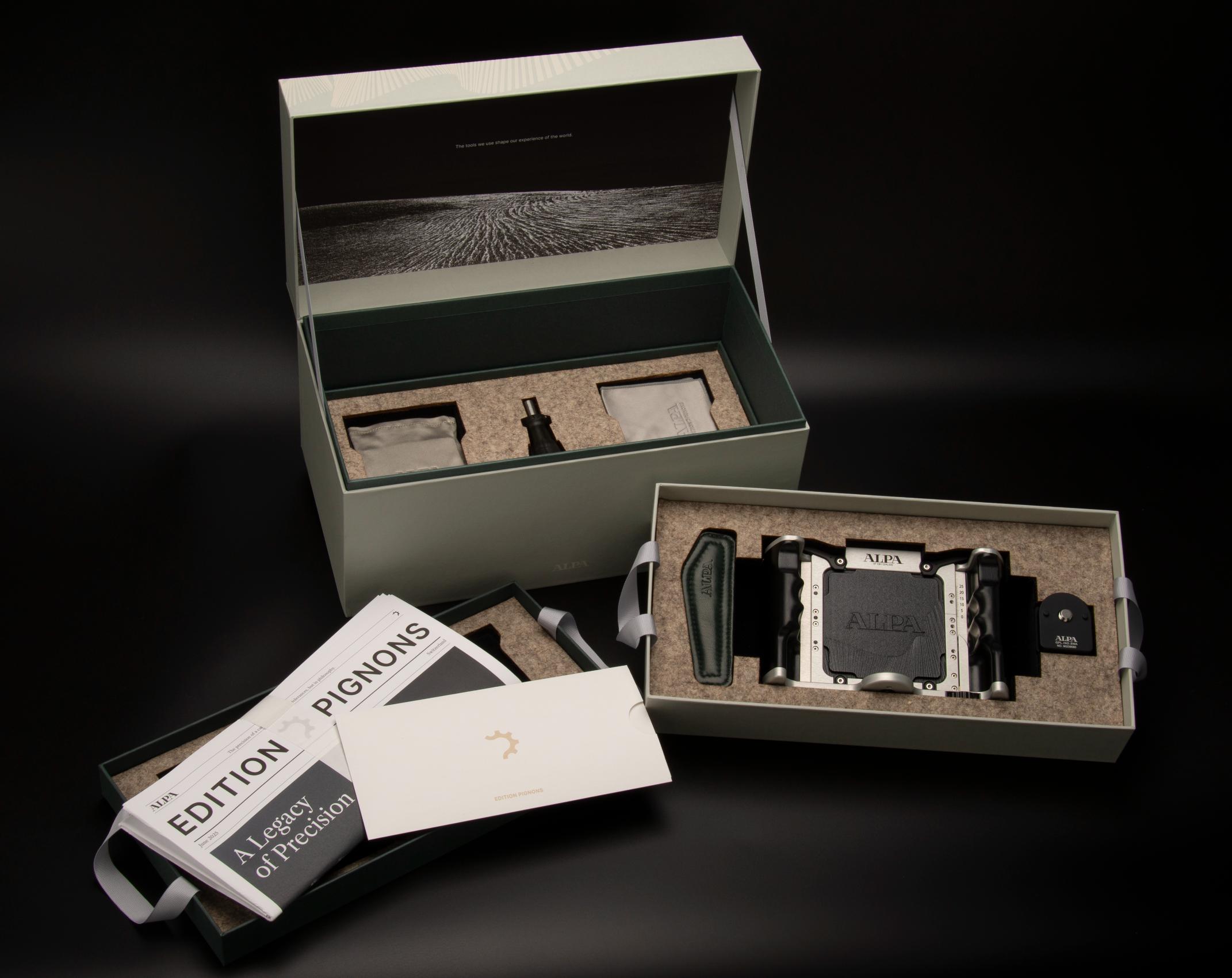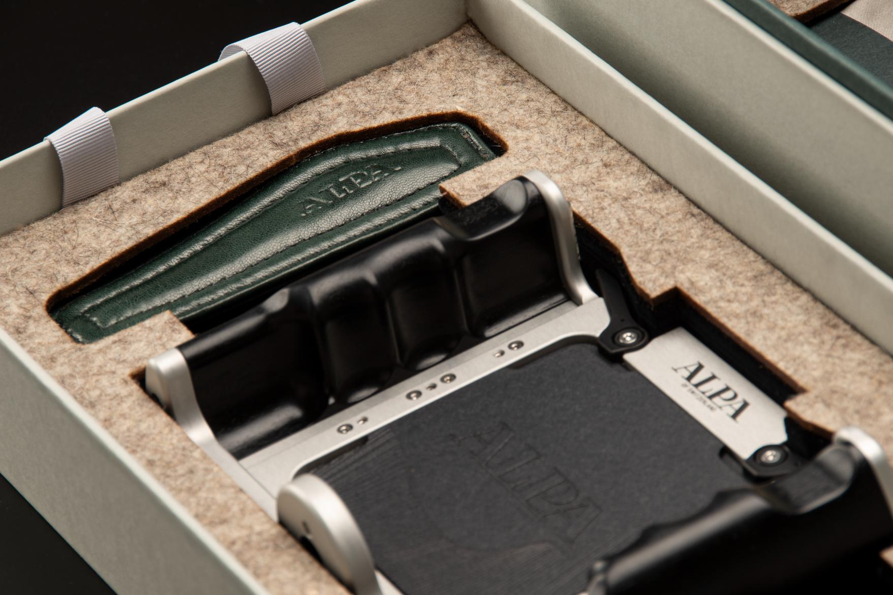 Exclusively designed for the Pignons Edition, this limited handstrap reflects the same dedication to craftsmanship and restraint that defines the camera itself. The outer surface is made from black shrinked cowhide leather – a full-grain material whose naturally tightened texture offer both durability and grip. Rich in tactile character, it complements the mechanical clarity of the Pignons design with a sense of grounded confidence. Its robust grain echoes the engineered surfaces of the camera, adding a layer of visual and functional harmony. On the inside, where the strap touches the skin, lies a contrasting secret: dark green lamb nappa leather. Soft, smooth, and refined, it brings a subtle sensuality to the hand’s interaction with the object. The lamb nappa’s fine grain and supple nature offer quiet luxury, balancing the structural presence of the outer cowhide with a gentle counterpoint. The deep green tone – reminiscent of alpine moss or shaded forest paths– evokes a connection to nature that mirrors the camera’s Swiss origin.